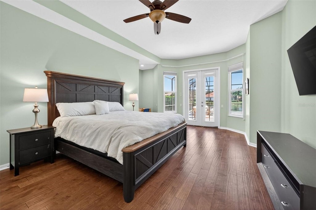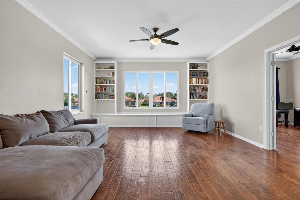 Enjoy peaceful premium lake views and over 3, 500 sq. ft. of elegant living space, designed for both comfort and entertaining. This 4 bedroom, plus 2 office/flex rooms, 3 bath home offers a great floor plan for many uses. The main level includes the primary suite, private guest room, plus office while the second floor adds a spacious bonus/media room plus two additional bedrooms and an office/flex room. The home features hurricane-impact windows, wide-plank engineered hardwood flooring, and luxurious crown molding. An updated kitchen with an oversized island, granite counters, and gas range. The expansive pool area overlooks the shimmering lake, offering a serene backdrop from nearly every room. A 3-car garage, and spacious lot complete the package. Silver Oak is an exclusive sought-after enclave of luxury homes known for its lush landscaping and mature oaks. A gated community, and ideal Sarasota location minutes from world-class beaches, dining, shopping, and the Legacy Trail. With its thoughtful upgrades and refined finishes, this home represents today's finest standards of Florida living!